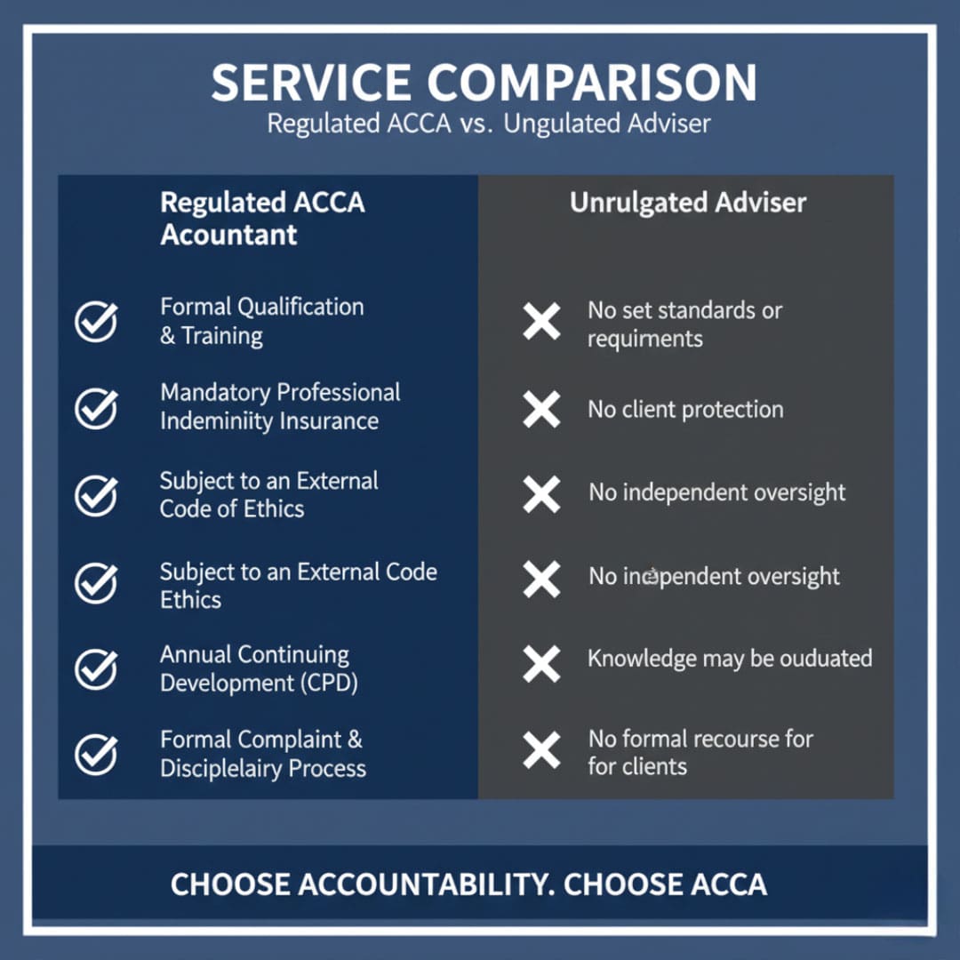 ACCA doesn’t guarantee the work, but it regulates members and can investigate complaints, providing protection not available with unregulated advisers.