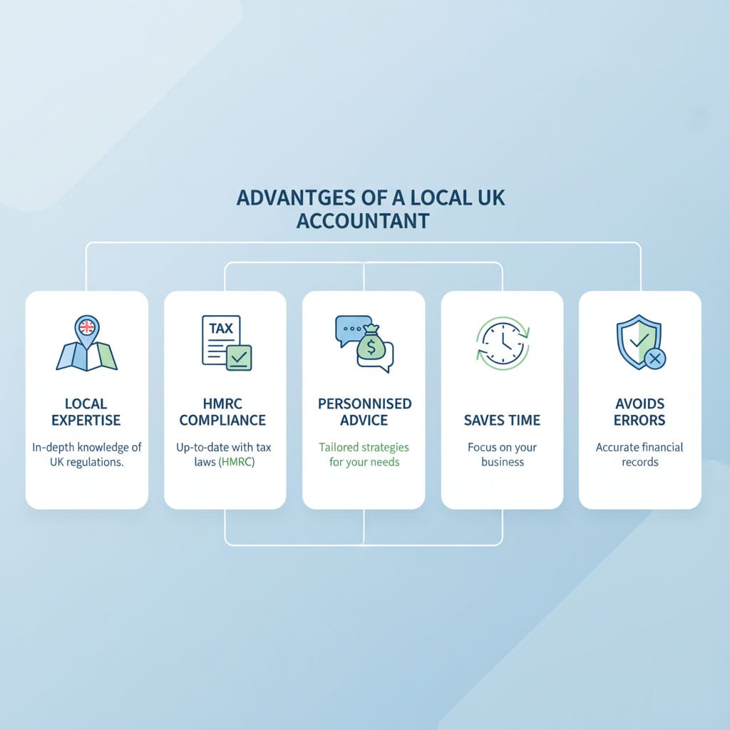People prefer local accountants for their reliability and understanding of the area’s tax rules and market. They provide personalised support with Self Assessment, bookkeeping, payroll, VAT, and ongoing financial advice.