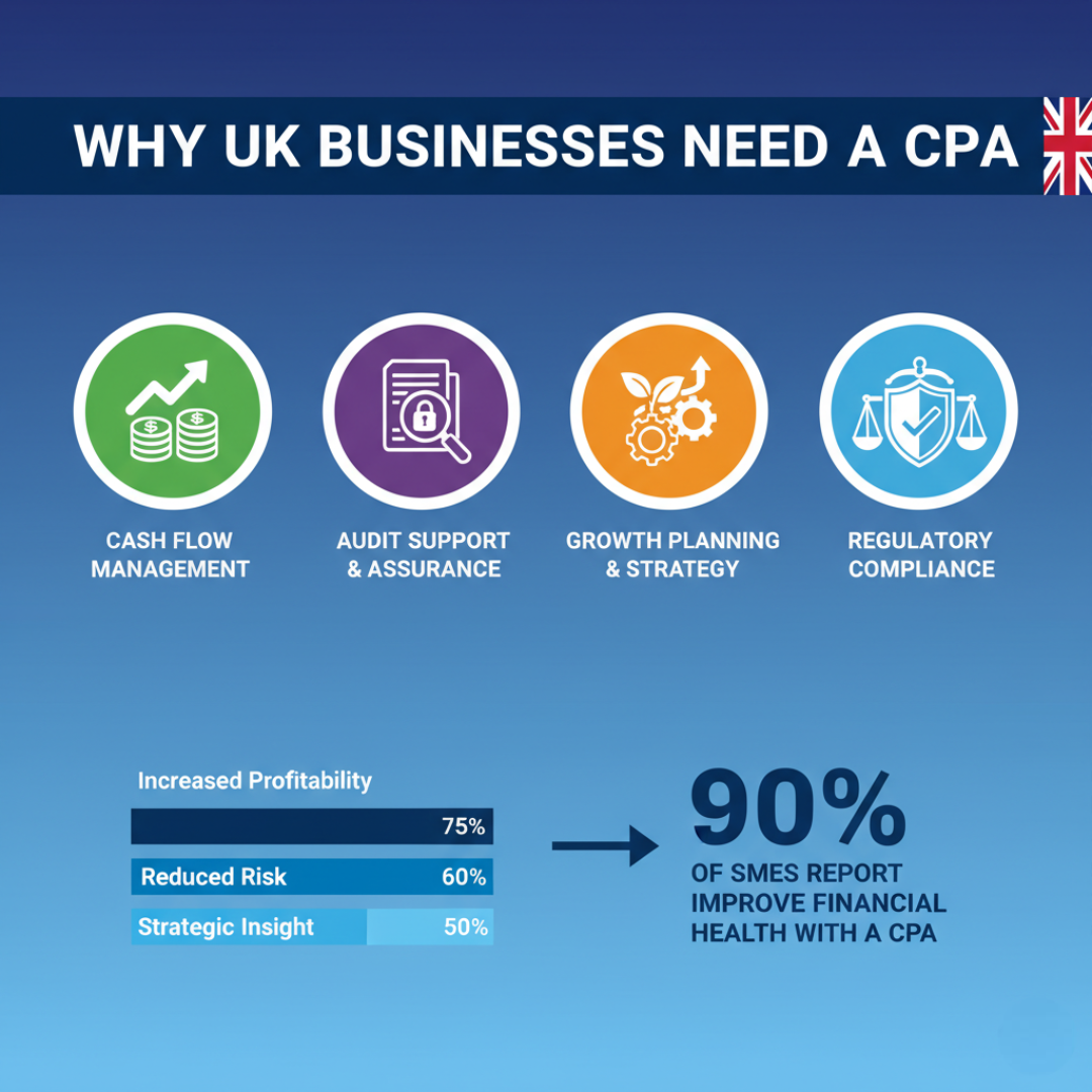 Example: A growing UK SME can rely on a CPA to streamline finances, prepare for HMRC audits, and plan for future growth.