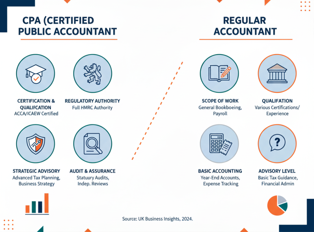 In simple terms: If a regular accountant handles your monthly bills, a CPA helps you plan, save taxes, and represent you in front of HMRC.