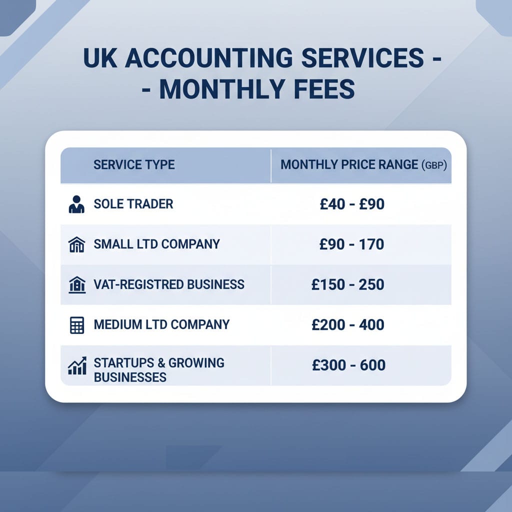 A financial accountant’s cost in the UK depends on your company size, payroll needs, VAT status, transaction volume, and overall accounting complexity. Smaller businesses may pay as little as £60–£150/month, while limited companies with VAT and payroll typically pay £150–£400/month.