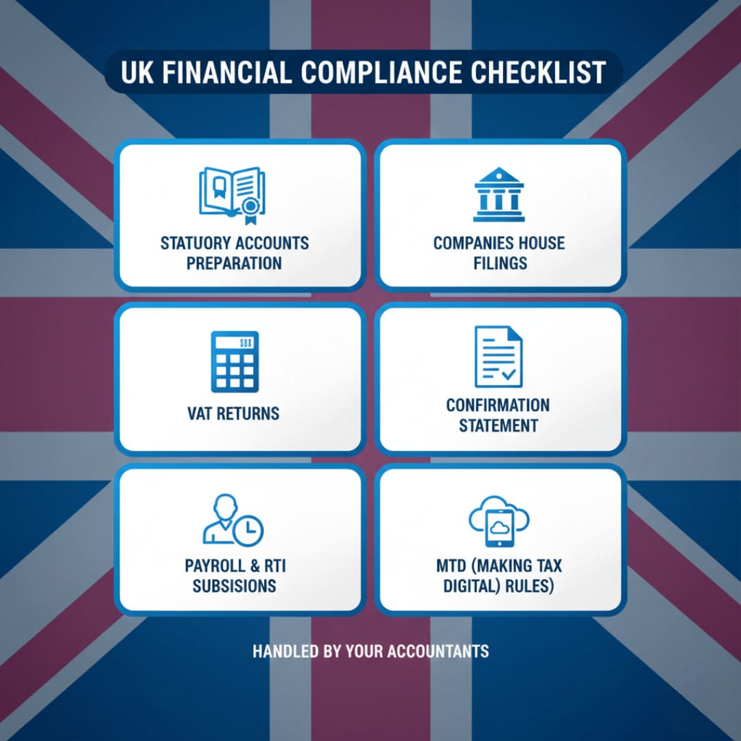 Services include financial statements, year-end accounts, VAT & tax compliance, cash flow, payroll, and audit support to ensure UK regulatory compliance.