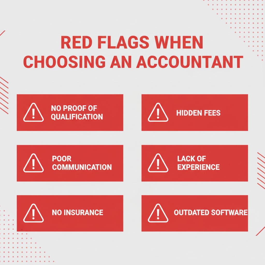Avoid accountants who can’t verify chartered status, hide fees, communicate poorly, offer unrealistic pricing, lack relevant experience, or refuse insurance/reference checks. - Assess Compatibility
